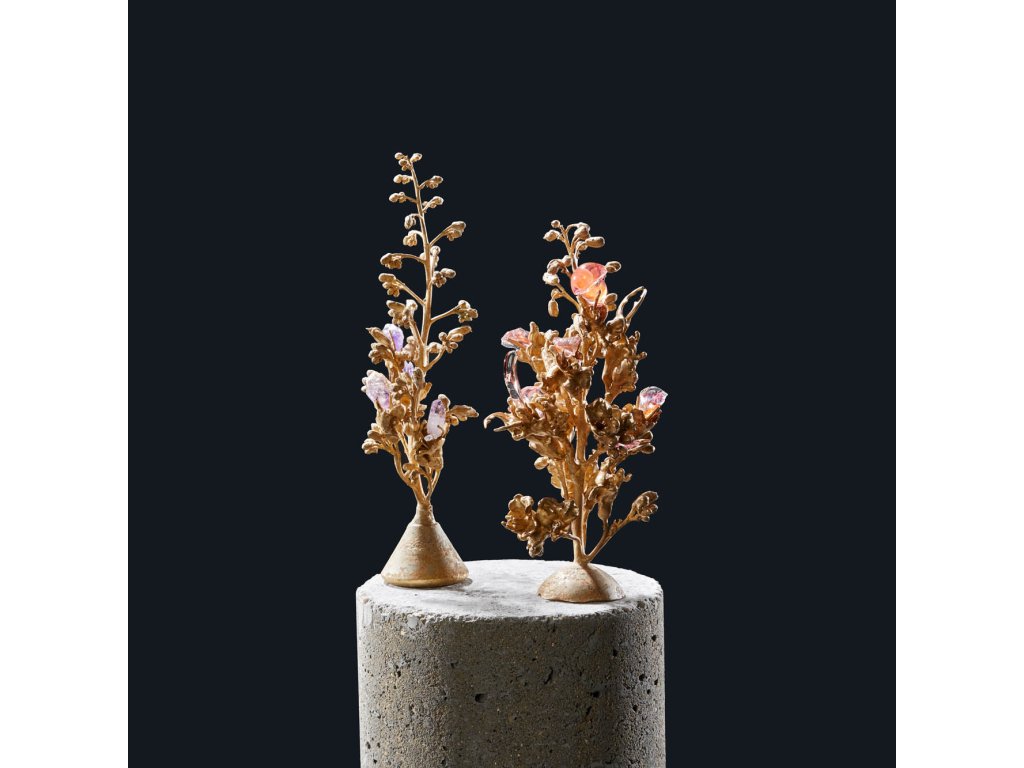 The trio of Chestnut Blossom objects was created in the spring of 2022 as a kind of reliquary of living nature. The pink chestnut is exceptional in its beauty and is not commonly seen. The model for these objects was a blossoming tree in the Wallenstein Garden in Prague near my studio. Chestnut trees come in different cultivated varieties, so I placed amethyst crystals and a glyptic carved amethyst flower in the bronze blossoms. As I often do in my work, I used an entire inflorescence of blossoms and prepared it for casting with a special technique of frying in wax. I then let it burn out of the mold. Before that, however, I modeled small intruders into the flowers. Horned beetles peek out from among three blossoms. The pink glass set in bronze is meant to evoke pink chestnut blossoms.