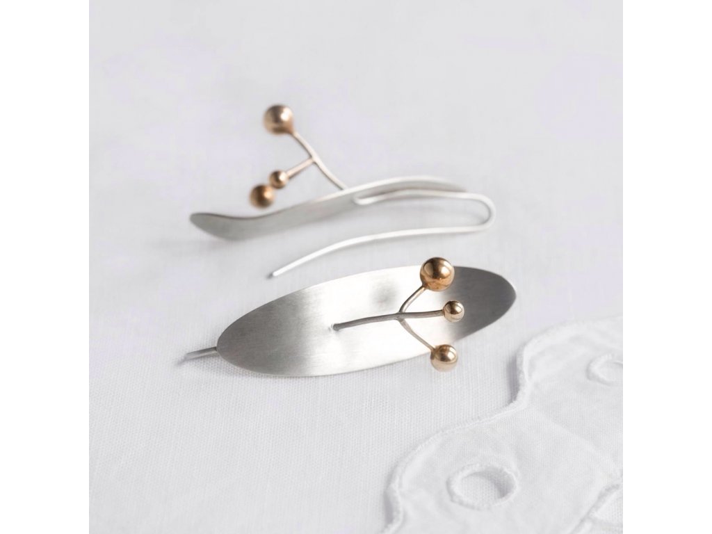 The Tilia (linden) Collection is inspired by the shape of the akenes of the little-leaf linden tree with their spherical seeds. In this instance, nature is geometricized, with the akenes stylized in the clean minimalist shape of an ellipse, while the small spheres are made of gold, silver or pearls. This collection was created at the behest of the Ministry of Foreign Affairs, for whom I designed representational gift items in the form of necklaces with linden motifs. The spheres in this case were in the tricolor of the Czech flag. I continued to work with this shape, and Tilia was born. In 2013, I was nominated for the prestigious Czech Grand Design award in the Jewelry of the Year category for this collection.